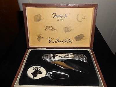 VINTAGE FURY COLLECTIBLES 36684 DEER FOLDING KNIFE WITH KEY CHAIN IN WOOD BOX