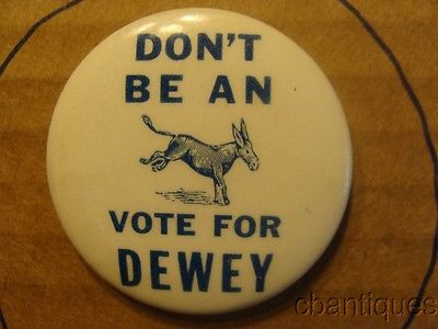 Title (ebay affiliate link): VERY RARE 'DON'T BE AN ASS VOTE FOR DEWEY" CAMPAIGN PIN 1 3/4" FS W/BIN