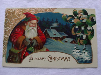 Antique postcard A Merry Christmas red robe santa claus cabin gloss Saxony