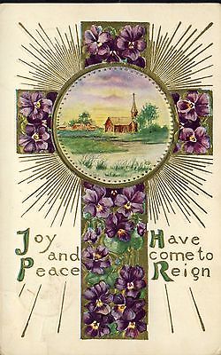 Religious postcard"Cross with flower and scene plus verse c/wCanada #149