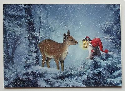 GNOME with LANTERN meeting a ROE DEER Sweden Tomte Nisse Santa Elf Card