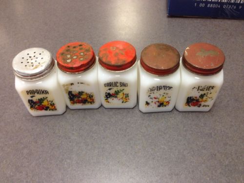 Vtg Set of 5 Milk Glass Spice Jars Red Metal Lids