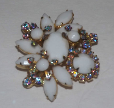Vintage Milk Glass & Aurora Borealis Rhinestones Brooch