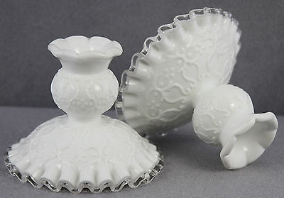 Title (ebay affiliate link): VINTAGE PAIR SILVER CREST MILK GLASS CANDLE HOLDERS FENTON SPANISH LACE PATT