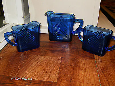 Hazel Atlas Ritz Blue Chevron Pattern Milk Pitcher, Creamer And Sugar Bowl