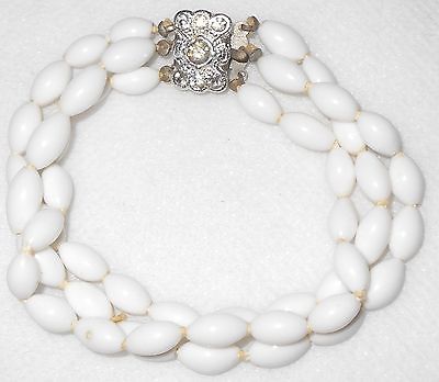 Vintage Milkglass Bead Rhinestone White 3 Strand Bracelet