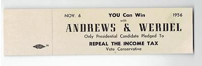 1956 STATES RIGHTS PARTY ANDREWS WERDEL CARDBOARD TICKET 1 1/2" X 6"