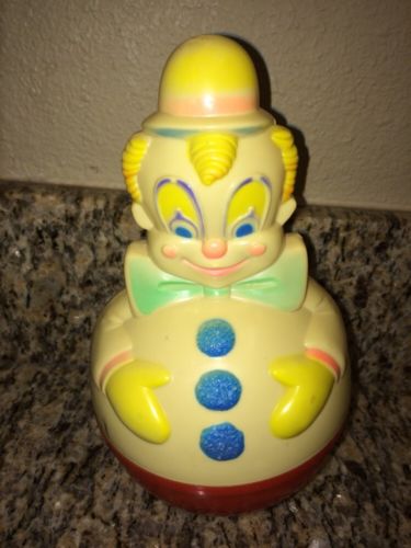 Title (ebay affiliate link): VINTAGE SANITOY CLOWN WOBBLING BABY TOY CHIME SOUND 1977 WEEBLE LIKE GUC 7 1/2"