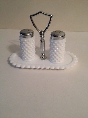 Vintage Milk Glass Salt & Pepper Shakers With Caddy