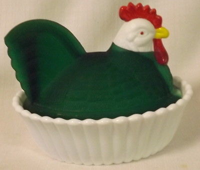 Title (ebay affiliate link): Green Satin w/ Milk Head Covered Chicken Rooster Dish - Westmoreland Glass mould