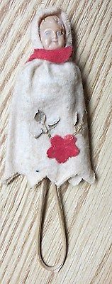 ANTIQUE BABY RATTLE CELLULOID? squeaky toy DOLL head RARE!! wood cloth