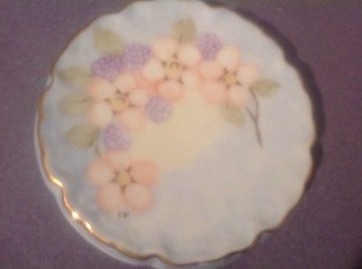 Title (ebay affiliate link): Antique 7" Pocelien Hand Painted Hot Plate Light Blue with Pink Purple Flowers