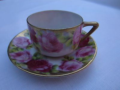 ANTIQUE BEYER & BOCK FINE CHINA DEMITASSE CUP & SAUCER W/ PINK ROSE DECORATION