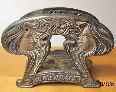 Antique ART NOUVEAU Two Ladies FACES LETTER Napkin HOLDER Bronze Painted Metal