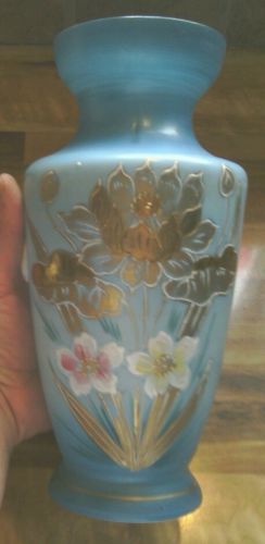 ANTIQUE VICTORIAN BRISTOL BLUE HAND PAINTED GLASS VASE 1880's