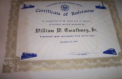 Title (ebay affiliate link): Baltimore & Ohio Railroad/B&O RR Certificate of Retirement 1957