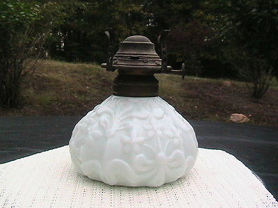 Nice Antique Miniature Oil Lamp / Milk Glass / Pattern unknown / Embossed Fl
