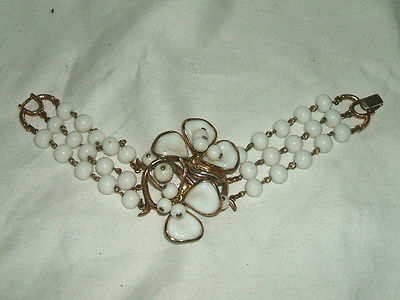 EARLY CROWN TRIFARI POURED WHITE MILK GLASS 3-ROW BEADED FLOWER BRACELET AS IS