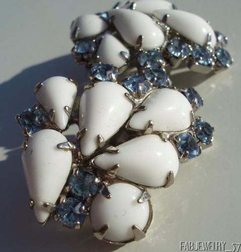 Title (ebay affiliate link): VINTAGE Earrings WEISS Blue Glass Rhinestone Milk Glass Chunky Silver Tone Clip