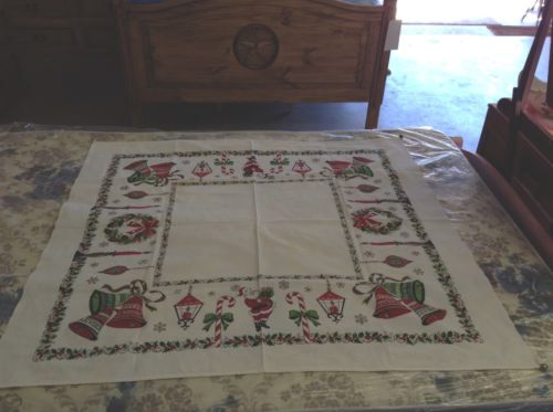 Title (ebay affiliate link): Vintage Christmas Tablecloth Approx. 50 X 45 Santa, Candy Canes And More Print