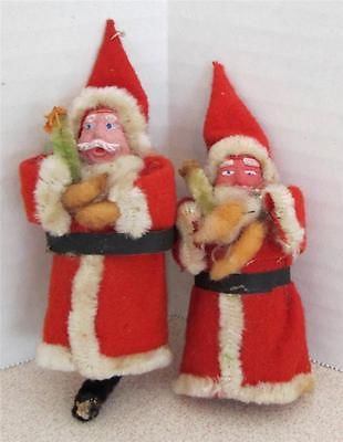 2 VINTAGE CLAY / COMPOSITION FACE SANTAS HOLDING CANDLES - FELT & CHENILLE
