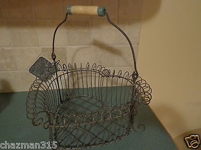 Vintage Metal Heart Shaped Primitive Wire Egg Basket with Wood Handle