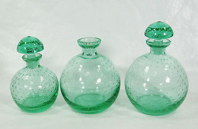 VICTORIAN CRYSTAL PERFUME BOTTLE AQUA GREEN GLASS BLOWN HOBNAIL JAR SET PHARMACY