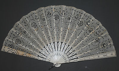 FINE ANTIQUE FRENCH HAND CARVED STICKS SILK LEAF FAN