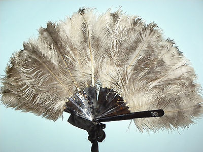 ANTIQUE FRENCH HAND CARVED FAUX TORTOISESHELL STICKS OSTRICH FEATHER LEAF FAN