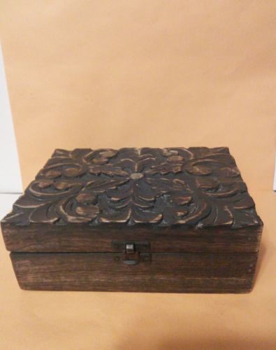 Title (ebay affiliate link): Vintage Hand carved Wood Trinket Box BOLD Very Good Condition 8 x 6 x 3" approx.