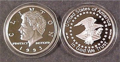 Title (ebay affiliate link): BILL CLINTON 1 OZ ROUND ( 100 MIL of .999 SILVER )