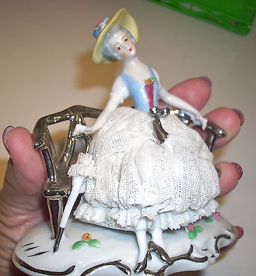 Title (ebay affiliate link): VINTAGE DRESDEN LACE LADY ON A SILVER BENCH WITH A PARASOL - UNKNOWN HALLMARK