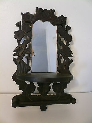 Antique Victorian Black Forest Wooden Mirror Shelf Sconce Carved Birds Flowers