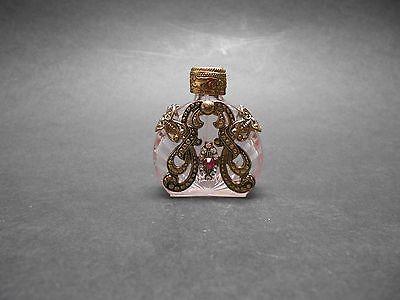 Vtg Czech flligree perfume bottle pink glass pink clear stones stone dauber