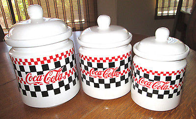 Title (ebay affiliate link): SET OF 3 GIBSON COCA-COLA CANISTERS 1997 WHITE WITH BLACK RED DESIGN LIDS ON ALL