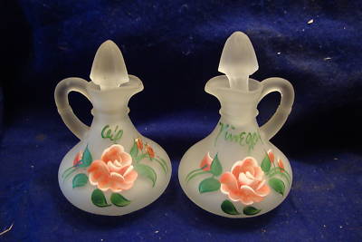 GLASS HAND PAINTED ROSE VINEGAR AND OIL CRUET SET