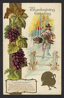 Vintage 1915 Embossed Thanksgiving PILGRIM WITH TURKEY T15