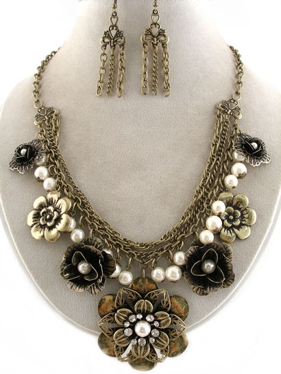 CHUNKY LAYERED ANTIQUE GOLD FLOWER BIB NECKLACE SET