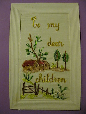 WW1 WWI Silk Postcard ~ TO MY DEAR CHILDREN ~ Cottage, Trees & Gate ~ from Dad
