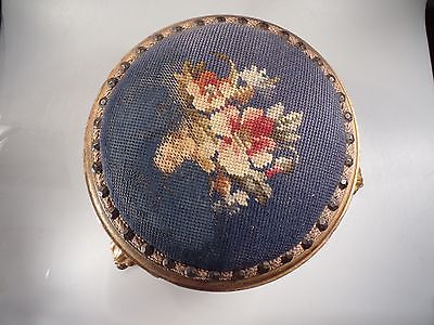 Title (ebay affiliate link): Vintage Metal & Wood Hand Embroidered Floral Ottoman Foot Stool w/ Ornate legs
