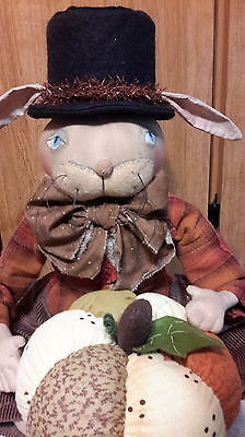 PRIMITIVE HANDCRAFTED FABRIC SITTING HARVEST BUNNY WITH PUMPKIN