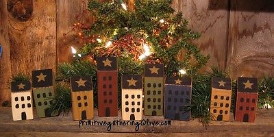 Title (ebay affiliate link): ~ A GATHERING of 9 Primitive Folk Art SALTBOX HOUSE Village Star Tuck OOAK