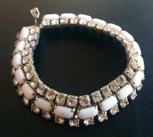 Title (ebay affiliate link): Vintage Bracelet Milk White Glass Bead Clear Rhinestone Silver Tone 4027
