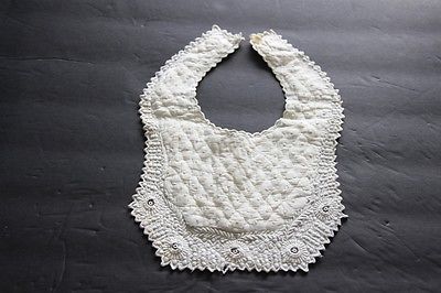 Title (ebay affiliate link): Lovely Antique White Cotton FANCY DOLL COLLAR Bib MOP Button Cutwork Trim