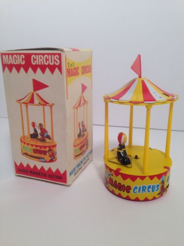 Title (ebay affiliate link): RARE Antique Tin Toy TPS Japan Magic Magnetic Action Circus Mechanical Carousel