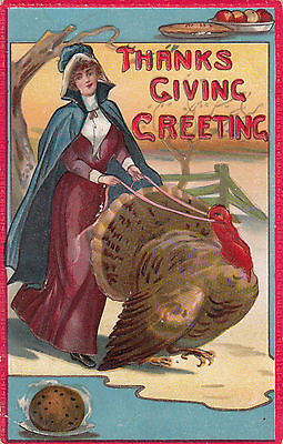 Thanksgiving Vintage Postcard Pilgrim Women Bridled Turkey 1909