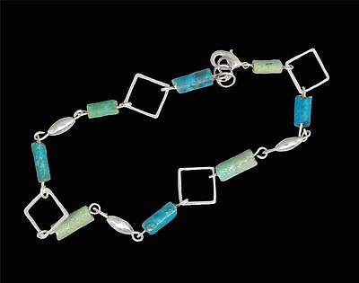 Title (ebay affiliate link): Egyptian New Kingdom faience jewellery beads 1200 BC reset on silver bracelet.