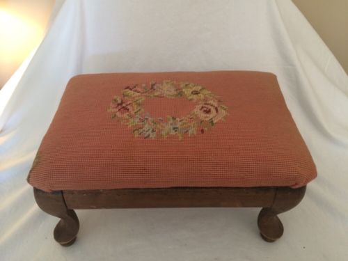 Title (ebay affiliate link): Vintage wool floral flower needlepoint foot stool carved wood & curved legs