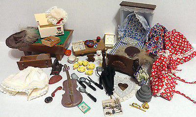 Title (ebay affiliate link): Vintage Lot Dollhouse Miniature Furniture Clothes Dishes Wooden Bed Antique ??