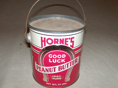 Title (ebay affiliate link): VINTAGE PEANUT BUTTER TIN WITH LID, TORONTO CANADA, HARRY HORNE'S GOOD LUCK